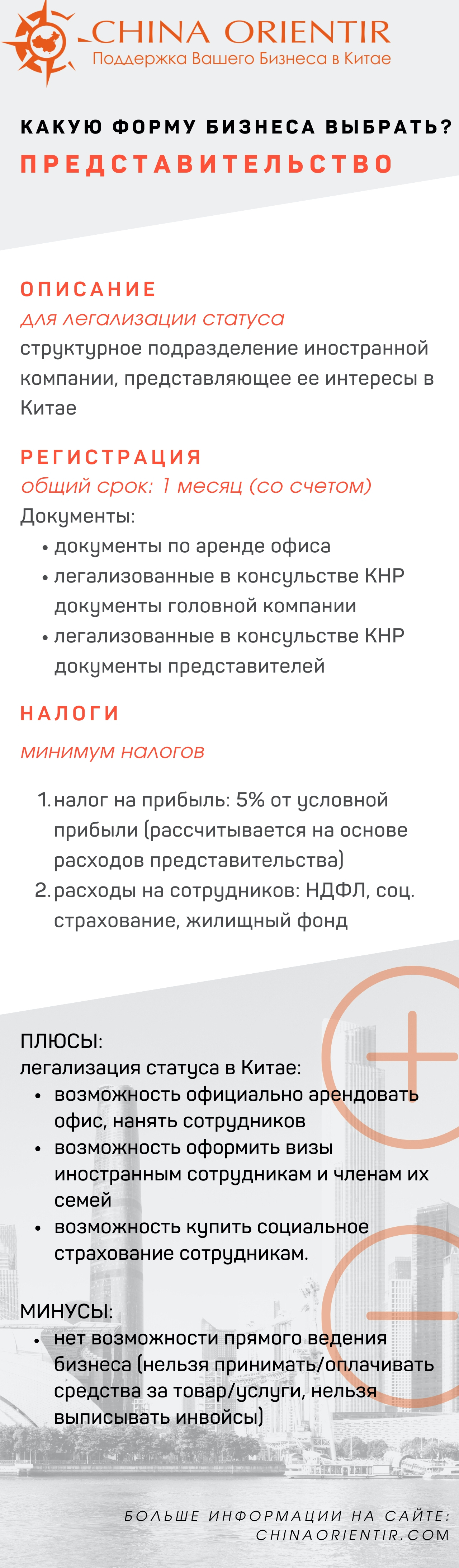 - Регистрация, бухгалтерское и визовое сопровождение представительства Вашей иностранной (российской, украинской, казахской и т. д.) компании на юге Китая. Такая структура подойдет тем, кому нужна легализация статуса офиса и сотрудников в Китае. См. памятку.