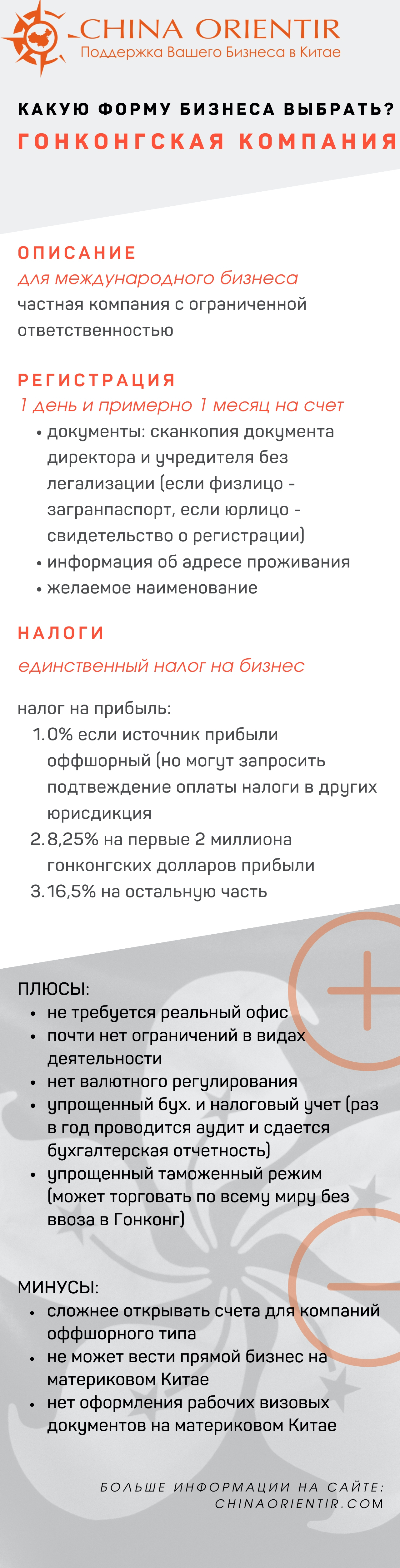 - Регистрация гонконгской компании и ее сопровождение (секретарские и бухгалтерские услуги). Этот вариант подходит для ведения бизнеса, если не требуется наличие своей бизнес-структуры на материковом Китае, и не требуется легализации статуса офиса/сотрудников здесь. См. памятку.