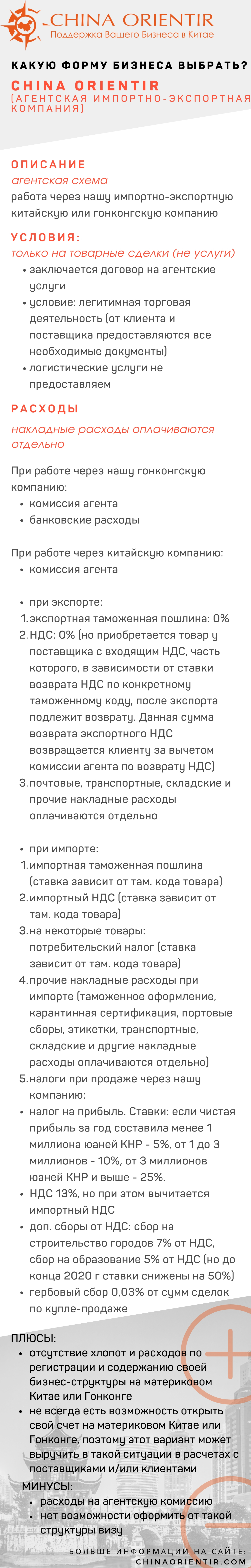 - И, наконец, если регистрация своей бизнес-структуры в Китае задача не этого этапа, мы можем предложить для Вас вариант работы через нашу китайскую или гонконгскую компанию, при условии, что деятельность полностью легитимна (предложение действительно только для товарных отправок, при наличии инвойса, договора и коносамента). См. памятку.